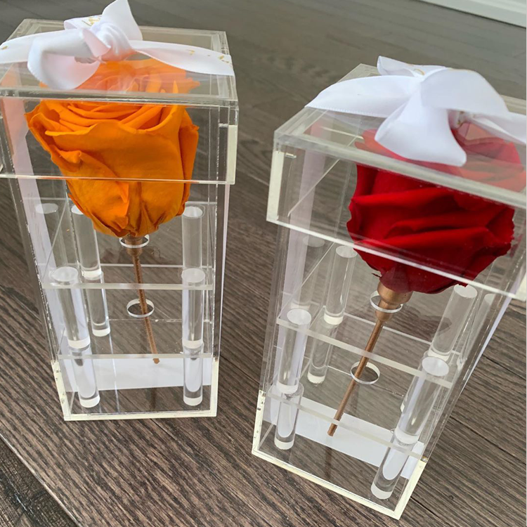 Luxury Single Rose Flower Holder Crystal Clear Acrylic Packaging Boxes For Eeternal flowers